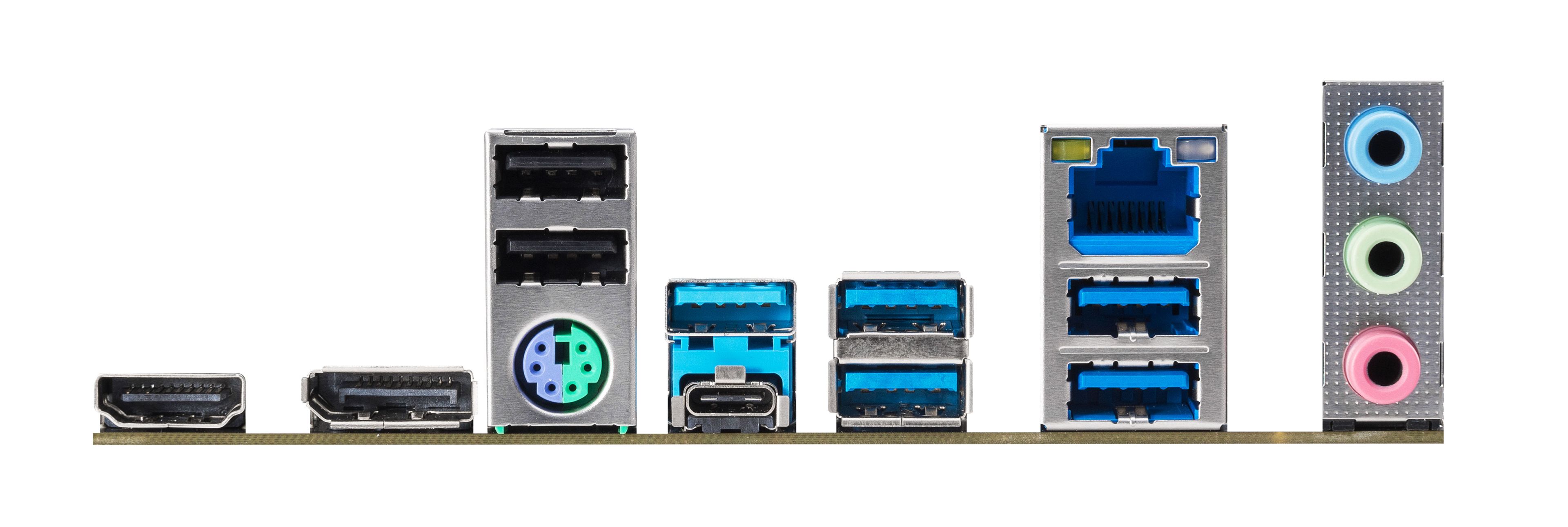 | Rückseite I/O Panel: | - 2 x Antenna Mounting Points - 1 x PS/2 Mouse/Keyboard Port - 1 x HDMI Port - 1 x DisplayPort 1.4 - 1 x USB 3.2 Gen2 Type-A Port (10 Gb/s) (Supports ESD Protection) - 1 x USB 3.2 Gen2 Type-C Port (10 Gb/s) (Supports ESD Protection) - 4 x USB 3.2 Gen1 Ports (Supports ESD Protection) - 2 x USB 2.0 Ports (Supports ESD Protection)* - 1 x RJ-45 LAN Port with LED (ACT/LINK LED and SPEED LED) - HD Audio Jacks: Line in / Front Speaker / Microphone *USB12 are the Lightning Gaming Ports. |
