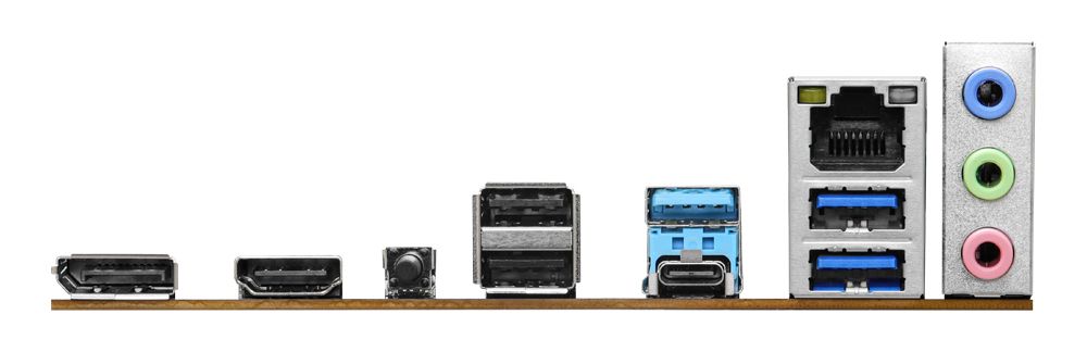 | Rückseite I/O Panel: | - 2 x Antenna Mounting Points - 1 x HDMI Port - 1 x DisplayPort 1.4 - 1 x USB 3.2 Gen1 Type-C Port - 3 x USB 3.2 Gen1 Type-A Ports - 2 x USB 2.0 Ports - 1 x RJ-45 LAN Port - 1 x BIOS Flashback Button - HD Audio Jacks: Line in / Front Speaker / Microphone |