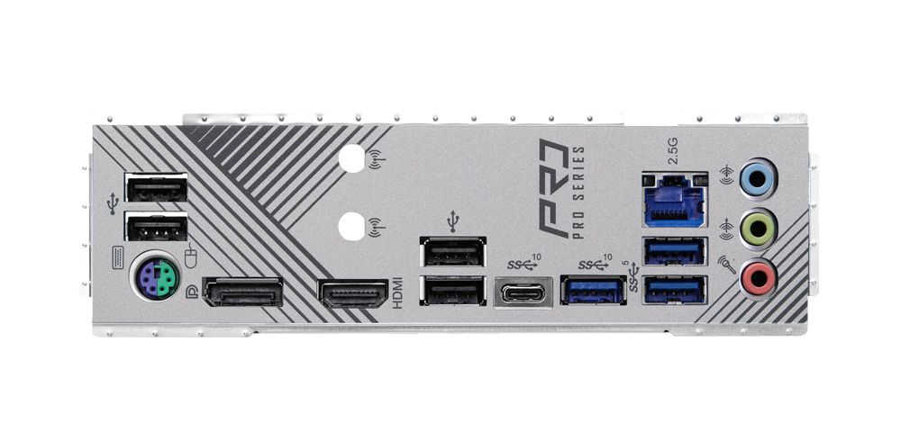 | Anschlüsse Rückseite: | - 2 x Antenna Mounting Points - 1 x PS/2 Mouse/Keyboard Port - 1 x HDMI Port - 1 x DisplayPort 1.4 - 1 x USB 3.2 Gen2 Type-A Port (10 Gb/s) - 1 x USB 3.2 Gen2 Type-C Port (10 Gb/s) - 2 x USB 3.2 Gen1 Ports - 4 x USB 2.0 Ports - 1 x RJ-45 LAN Port - HD Audio Jacks: Line in / Front Speaker / Microphone |